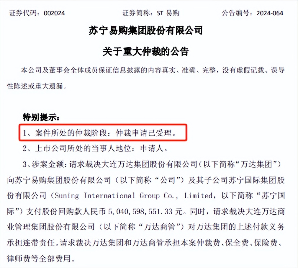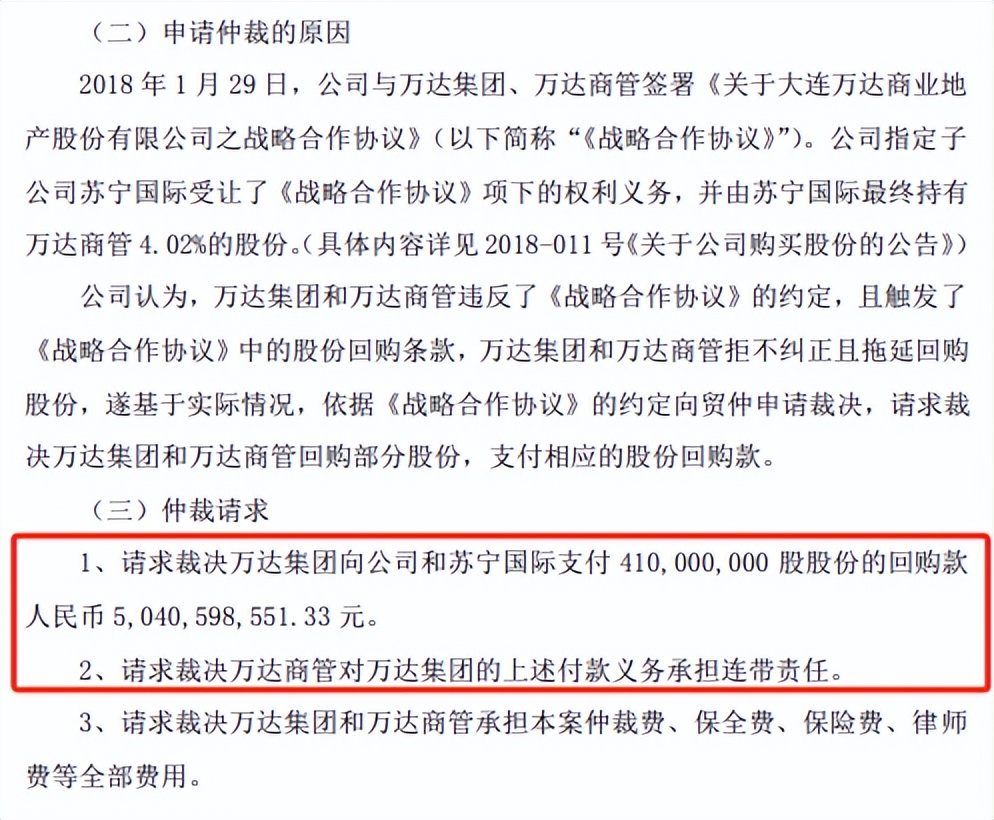 但现在,万达好像违反了协议,由于万达不愿意出这50亿回购股份,于是苏宁易购就申请了仲裁。