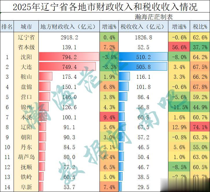在河南省仅仅出了全省、郑州市和驻马店市各个数据的情况下。辽宁省2025年的各地市一般公共预算收入、税收收入、税收比重的数据已经全部全部出炉,真是速度惊人。