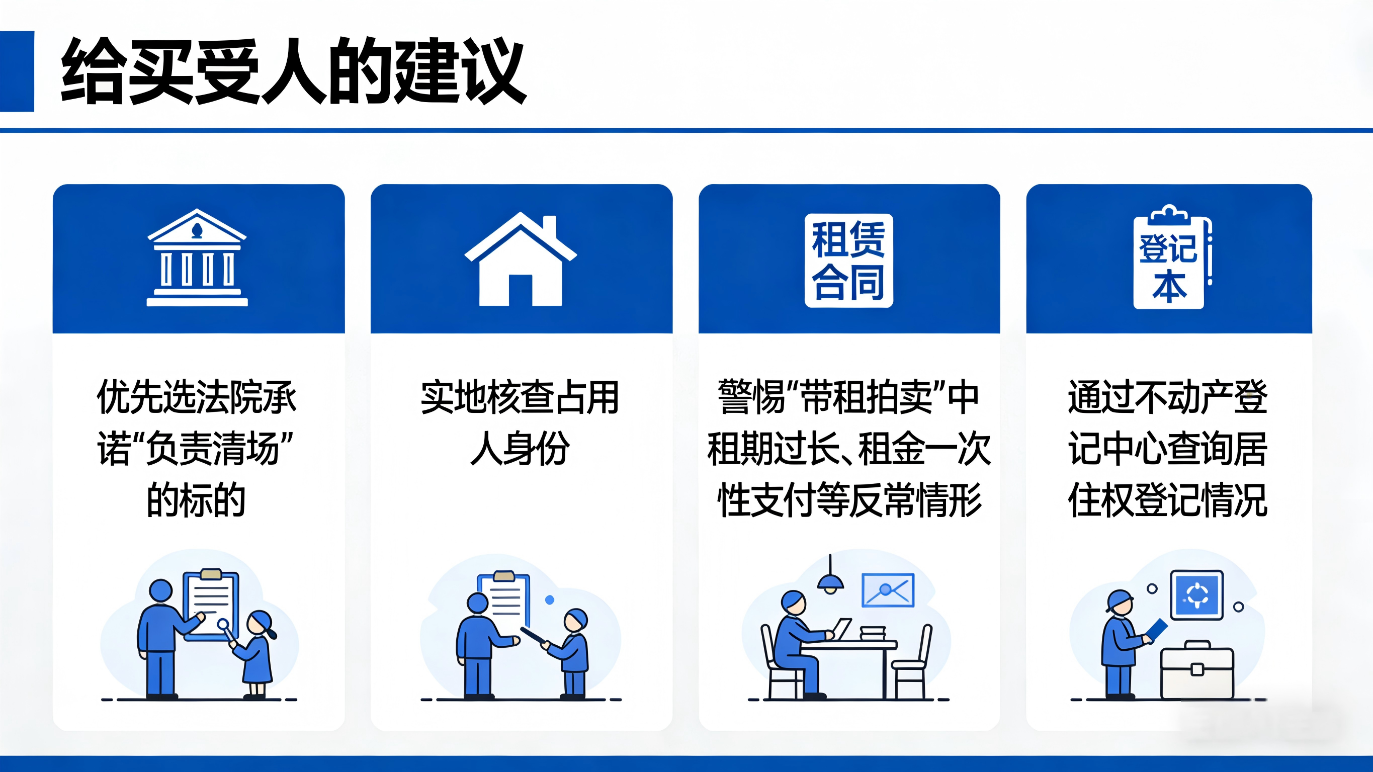给买受人的建议:优先选法院承诺“负责清场”的标的;实地核查占用人身份;警惕“带租拍卖”中租期过长、租金一次性支付等反常情形;通过不动产登记中心查询居住权登记情况。