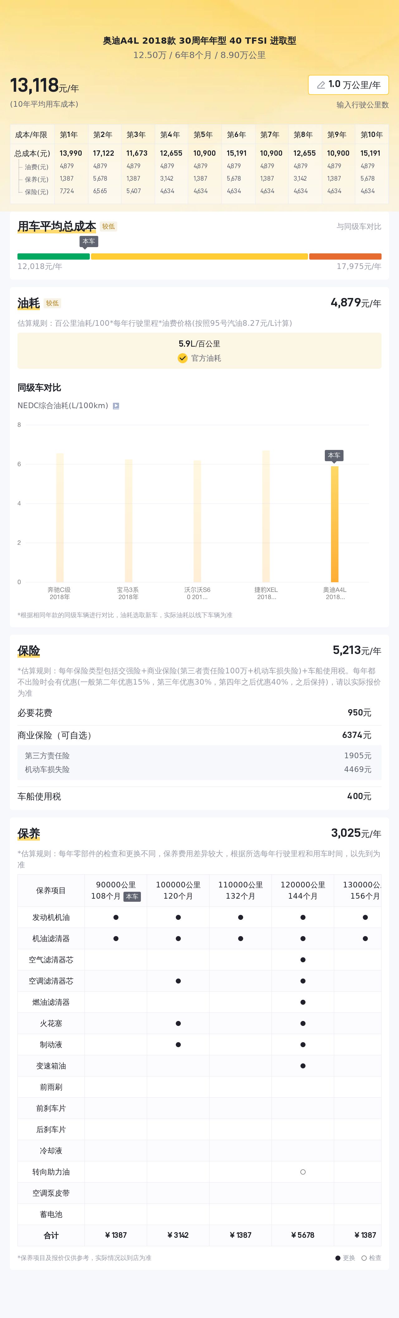 这辆车的年均综合用车成本大概在每年1.3万元左右,实际费用开销会根据车主的使用习惯有所不同。