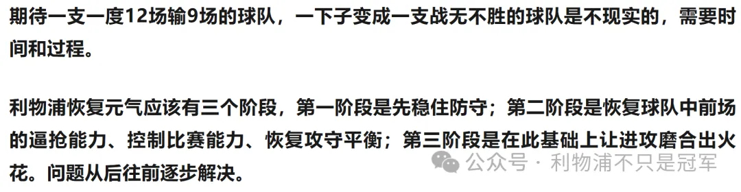 第二、利物浦的进攻观赏性和进球数都有提升此前一段时间,很多利物浦球迷不满球队比赛过程的枯燥乏味,但最近6场利物浦打进了20球,对马赛、卡拉巴赫、纽卡、布莱顿都单场进球3+。如果说卡拉巴格等对手实力有限的话,那利物浦对曼城下半场前30分钟的进攻非常有气势和说服力,只进一球实在可惜。对曼城最后虽然输了,但下半场这30分钟的进攻表现,以及最近7场有4场进球3+的数据,体现了利物浦在进攻上的进步。之前我们说过多次“利物浦恢复元气需要三个阶段”: