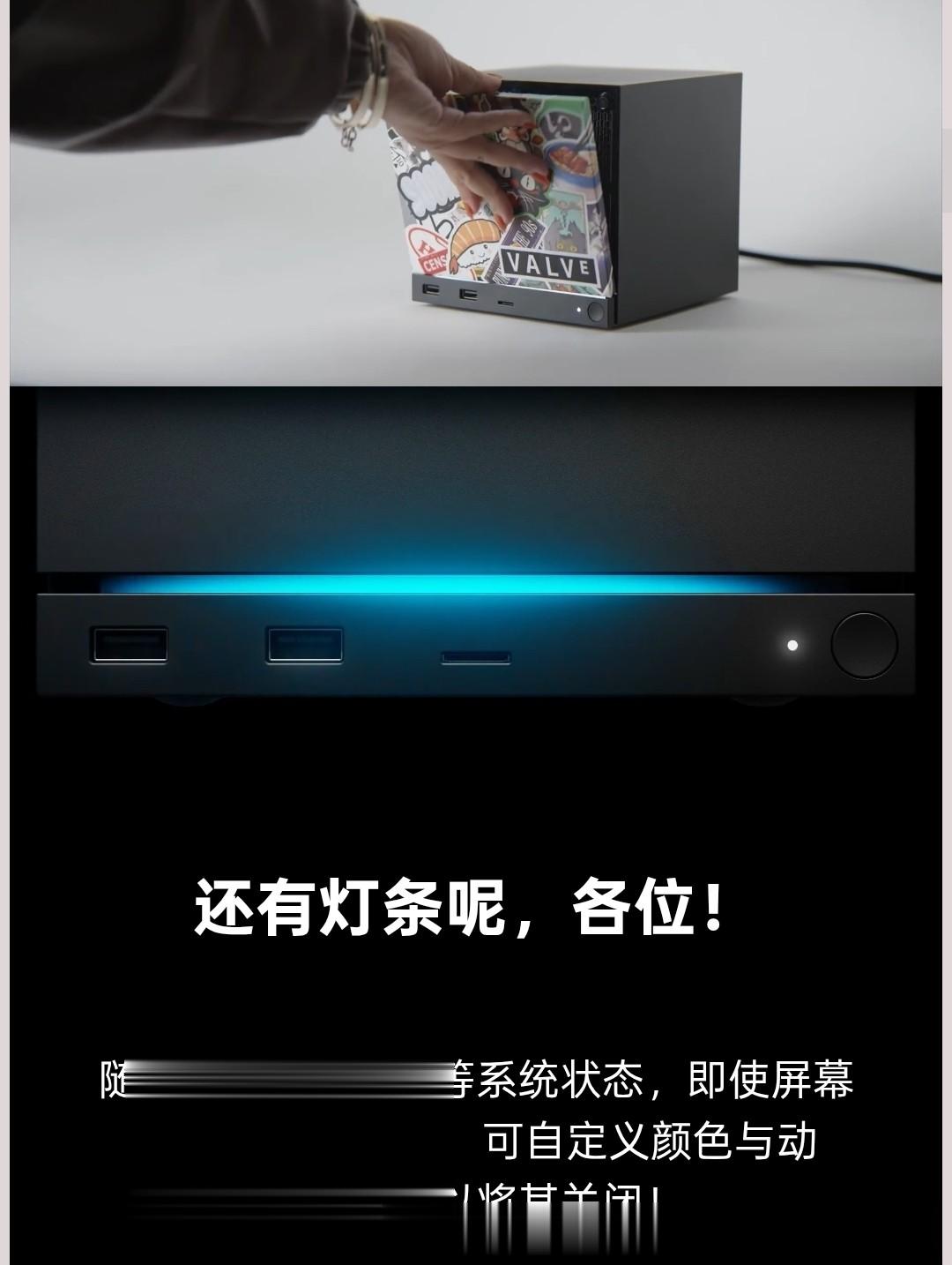 而且它支持更换2280规格SSD和升级内存,前面板还能自定义,RGB灯带也不浮夸,既满足了PC玩家的折腾欲,又有主机的便捷性。