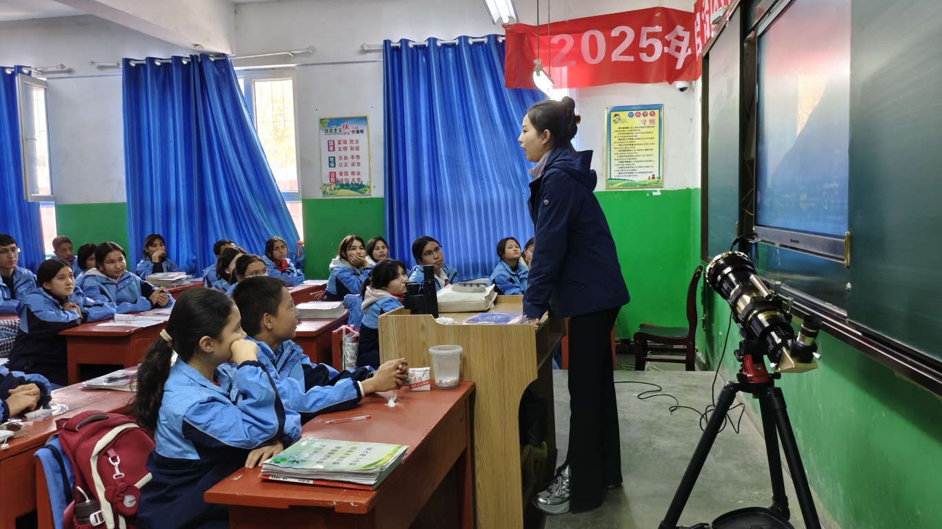 在和田市伊里其乡苏开墩小学与墨玉县希望小学,高崖子天文台为小学生们带来了生动有趣的“太阳探秘”课程。科普老师用形象的语言讲解太阳的结构、日珥的形成以及太阳黑子的活动规律,结合动画与实物模型,将遥远而炽热的恒星“搬到”孩子们眼前。