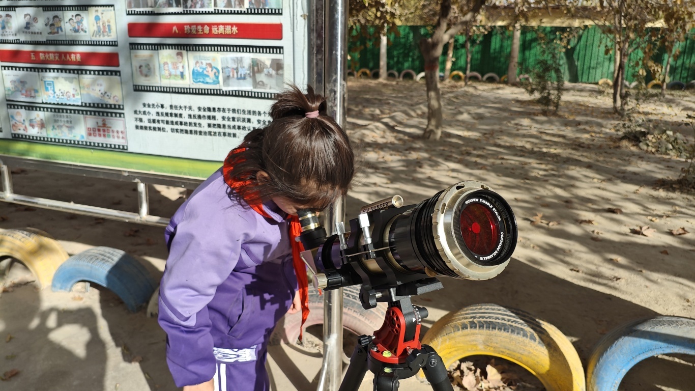 课程后,天文台科普老师指导学生使用专业日珥镜与手持望远镜,安全进行太阳实地观测。当在镜中清晰看到日珥如火焰般跃动于日面边缘时,同学们惊叹不已,纷纷表示“原来太阳不是只有一个颜色!” “它居然在动!”
