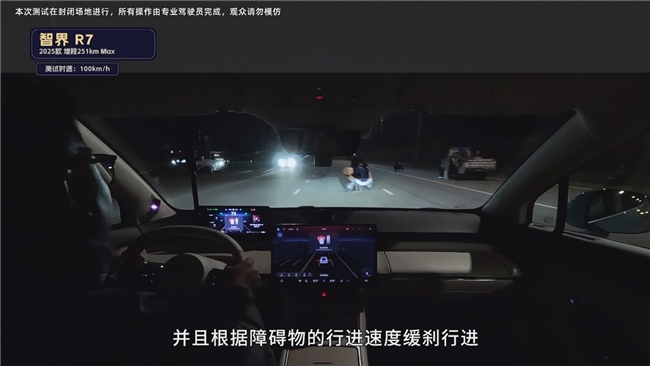 在夜晚逆光遇30度斜穿两轮车测试中,一般车辆往往容易受逆光干扰,在这种环境下难以察觉,人类司机经常反应不过来导致车祸发生,而智界R7通过AEB+eAES可轻松应对避免碰撞。