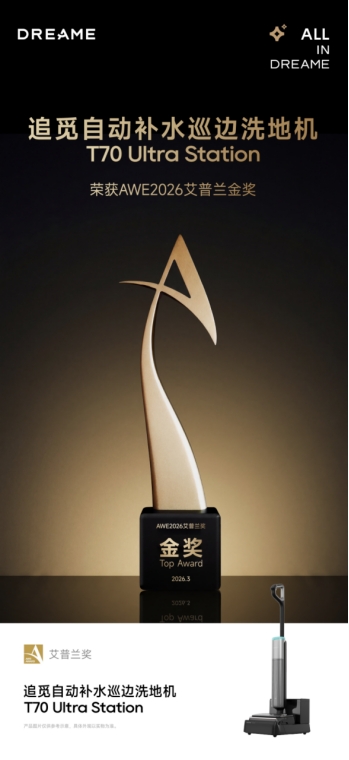 同期举办的 AWE2026 展会上,追觅追梦家 T70 Ultra Station 斩获家电界最高荣誉艾普兰奖金奖,成为本届展会唯一获此殊荣的洗地机产品,印证了追觅在洗地机领域的技术领先性,也为行业技术创新提供了重要参考。