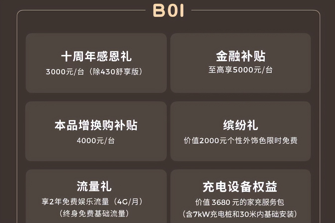 结合动力、续航、空间、价格和销量来看,零跑B01应该算是国产紧凑级轿车中表现极为出色的,它的厂商指导价格为8.98万-11.98万,12月份还有零跑的十周年感恩礼,除了低配,其余车型都有3000元的现金优惠,同时还有4000元的本品增换购补贴,再加上5000元的金融补贴、免费充电桩/安装服务等政策,优惠拉满了。(活动详情具体咨询当地门店)