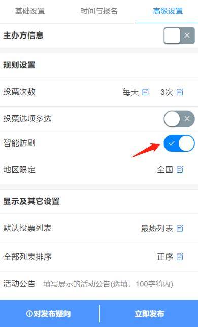 现在大部分的微信公众平台投票会使用第三方微信小程序投票平台如投票咖、票选助手、来票评等。平台免费提供验证码来检测用户的真实性,能够有效地防止刷票,保证活动的公平公正;主办方获取投票历史记录,通过刷票的时间、频率、ip地址等,来判断用户的投票行为是否是刷票;如果不放心还可以开启地区限定投票更多限度的防止刷票行为。