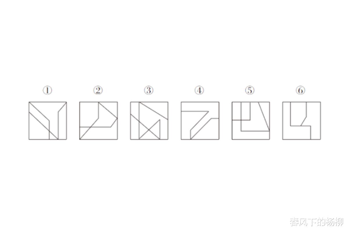 解析:图形外形全都是正方形,那么规律肯定是在内部。内部的规律只能从封闭空间、对称、交点、角的个数来判断。通过观察发现都没有任何规律。这时候我们可以考虑把相同的部分去掉,然后观察规律。你会发现①⑤⑥都不是一笔出来的,而②③④都是一笔画出来的形状。所以答案就是C喽。