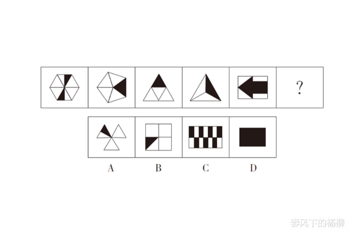 解析:这道题也不难,一眼看上去就看出图形都有黑色和白色,首先考虑黑白色的数量关系。经过观察没有规律可寻。所给图形都比较规整,考虑对称关系,除了第一个图形是中心对称外,其余均为轴对称,也没有规律。图形都有封闭空间,考虑封闭空间个数,经过观察也没有规律。这道题的规律其实在于白色或者黑色所占的面积。图一黑色占六分之一,图二为五分之一,其余依次是四分之一、三分之一、二分之一,所以问号处应该是全部黑色。答案为D。