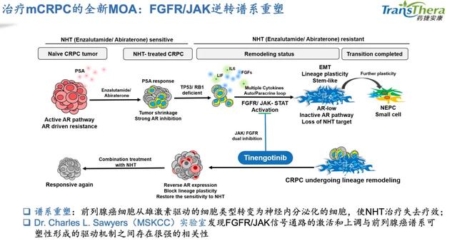 2022年发表于《科学》(Science)的一项里程碑式研究指出,JAK/STAT和FGFR这两条信号通路的异常激活是驱动谱系可塑性的核心机制。Tinengotinib恰好能同时精准抑制FGFR和JAK这两个靶点,从理论上具备了将癌细胞重新“编程”回对NHT药物敏感状态的潜力 。