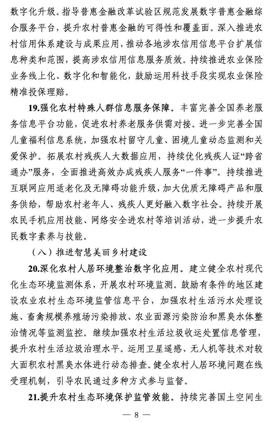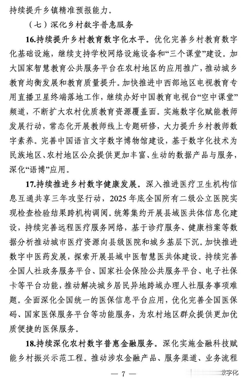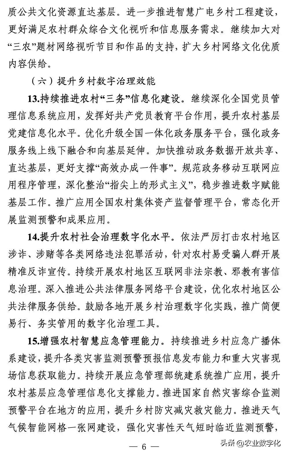 近日,中央网信办、农业农村部、国家发展改革委、工业和信息化部联合印发《2025年数字乡村发展工作要点》(以下简称《工作要点》)。《工作要点》要求,深入贯彻落实习近平总书记关于“三农”工作的重要论述和重要指示精神,全面贯彻落实党的二十届三中全会精神和中央经济工作会议、中央农村工作会议精神,按照《中共中央 国务院关于进一步深化农村改革 扎实推进乡村全面振兴的意见》的部署要求,深入实施《数字乡村发展战略纲要》,坚持学习运用“千万工程”经验,坚持发挥信息化驱动引领作用,锚定强农惠农富农任务目标,着力推动农业增效益、农村增活力、农民增收入,为加快建设网络强国、推进乡村全面振兴提供坚实支撑。