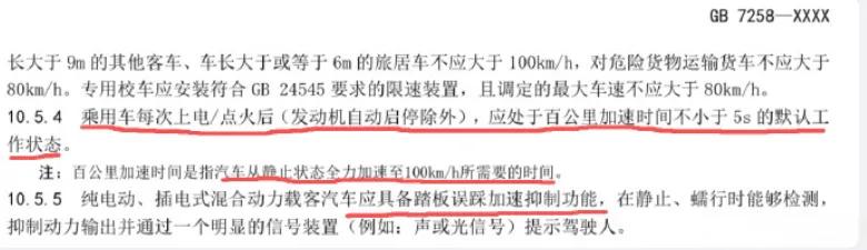 一是新能源车百公里加速时间需不小于 5 秒,同时要求配备踏板误踩加速抑制功能。