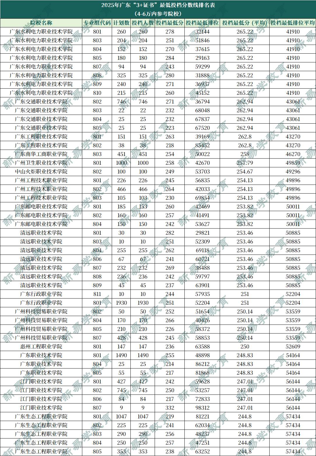 排位4~6万参考院校排位在4~6万,属于中分数段,人数还是比较多的,分数相差也比大,比较难选。这个层次的可以选择一些录取分数不高的公办院校。可参考的院校分别有广东水利电力职业技术学院、广东交通职业技术学院、广东工程职业技术学院、广东南华工商职业学院、广州卫生职业技术学院、中山火炬职业技术学院、广州工程技术职业学院、广东邮电职业技术学院、清远职业技术学院、广东行政职业学院、广州科技贸易职业学院、惠州工程职业学院、广东职业技术学院、江门职业技术学院、广东生态工程职业学院。