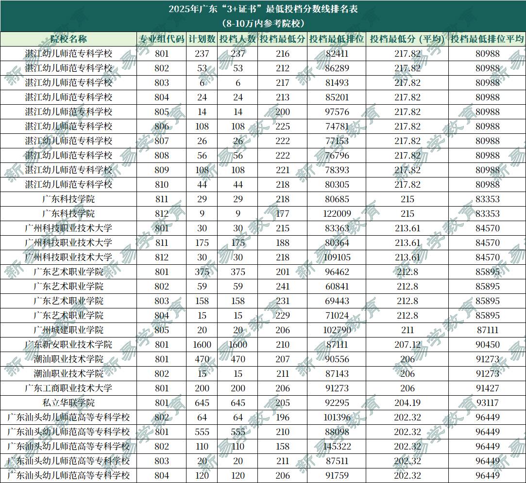 排位在8~10万,属于中低分数段,这个分数段以民办为主!虽然可选的院校专业组还是比较少的,可以选择一些分数不高的公办院校。可参考的院校有湛江幼儿师范专科学校、广东科技学院、广州科技职业技术大学、广东艺术职业学院、广州城建职业学院、广东新安职业技术学院、潮汕职业技术学院、广东工商职业技术大学、私立华联学院、广东汕头幼儿师范高等专科学校。