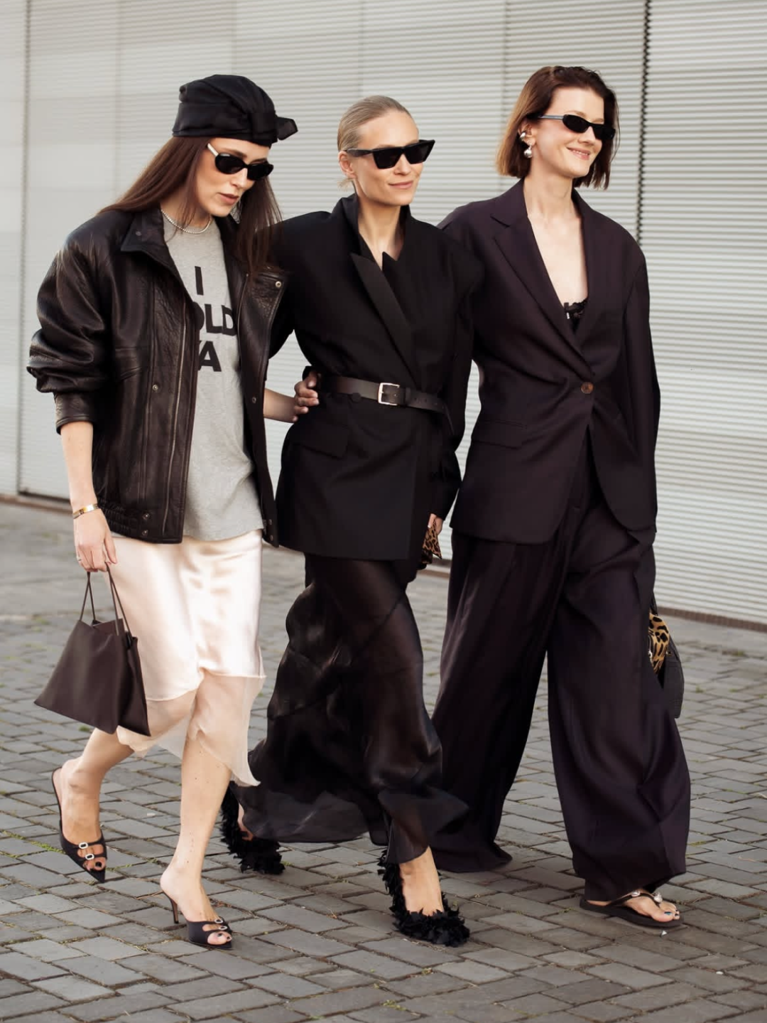 用 “夹克 + 裙子 + 阔腿裤” 的组合,既能靠阔腿裤抵御凉意,又能通过 “上装结构感 + 下装轻盈感” 的比例适配,避免某件单品过于强势,日常通勤、出街都能 hold 住,时髦又实用。