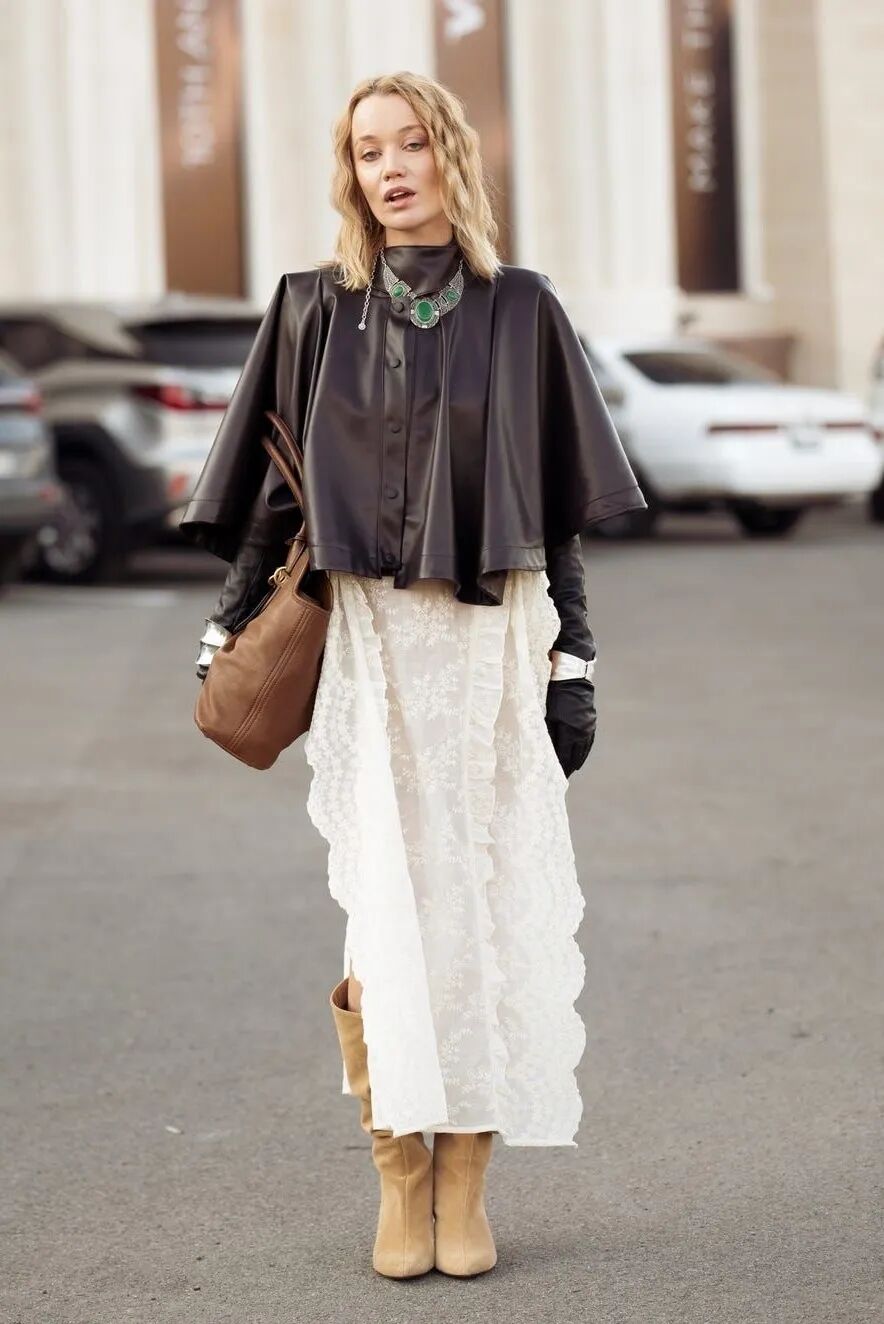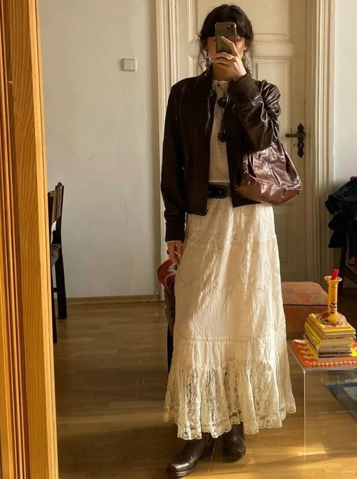 用硬朗的皮夹克搭轻盈的白色长裙,选择设计感长裙,打破 “基础款叠加” 的单调,既平衡风格又有记忆点,轻松穿出不费力的时髦感。