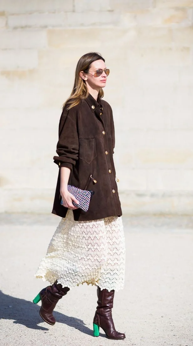 当硬朗的夹克遇上轻盈的裙子,不是风格的冲突,而是彼此的 “锦上添花”。