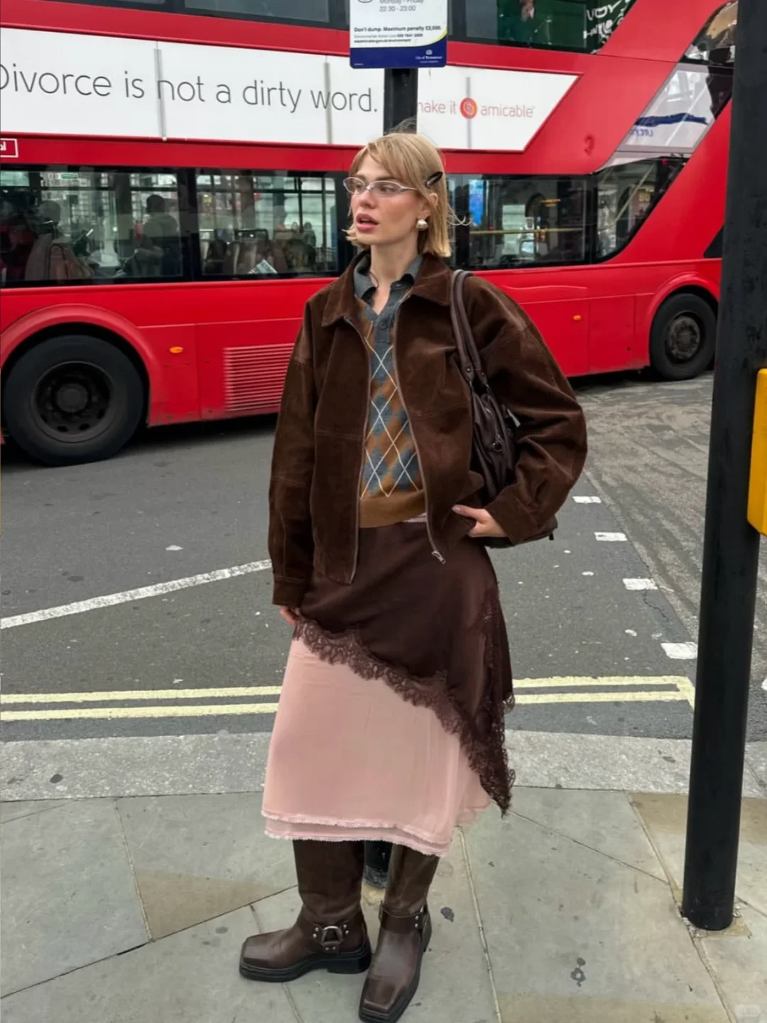 用鞋袜呼应夹克或裙子的颜色,不是简单的 “同色复制”,而是通过色彩延伸让上下装形成呼应 ,出门不用费心想配色,整体感直接拉满。