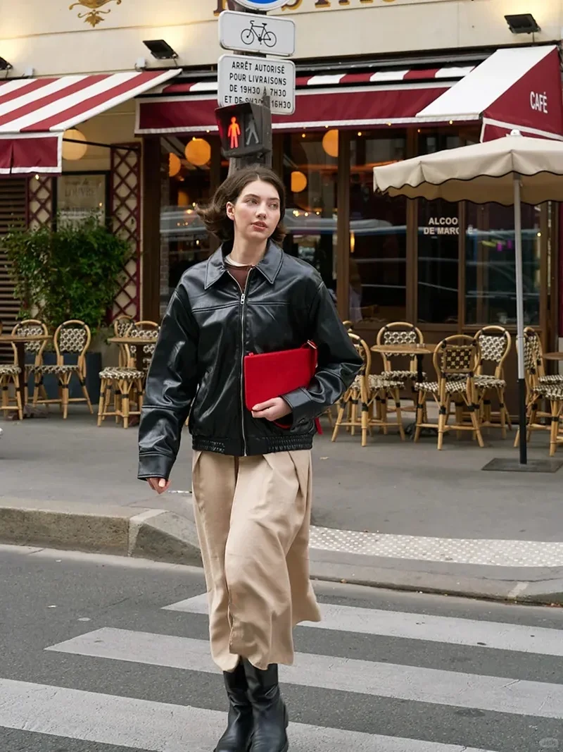 裙子度到膝盖或小腿中部最佳,太长易显拖沓;颜色选低饱和色(酒红、米色、浅咖)或基础色(黑色、白色),比亮色更能适配皮夹克的酷感,不会显得杂乱。
