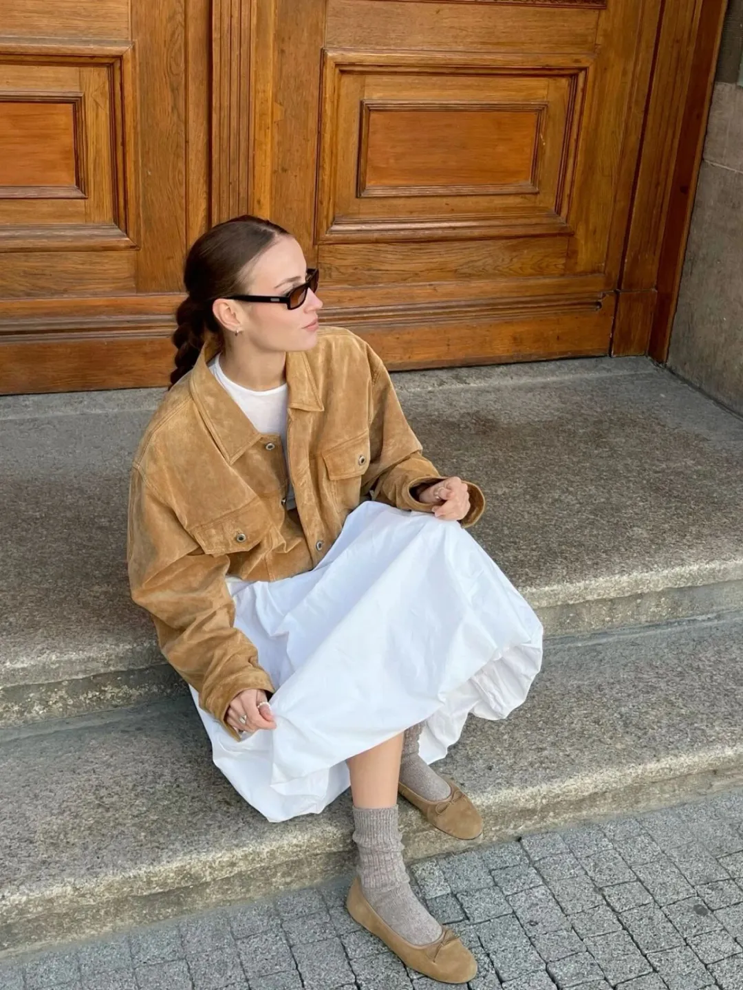驼色夹克 + 白色花苞长裙 + 卡其芭蕾鞋的组合,太懂秋日温柔感了,三者刚好形成 “暖 + 浅” 的和谐搭配 ,卡其芭蕾鞋鞋底轻薄不厚重,刚好能衔接花苞裙的轻盈,不会让下半身显沉重。