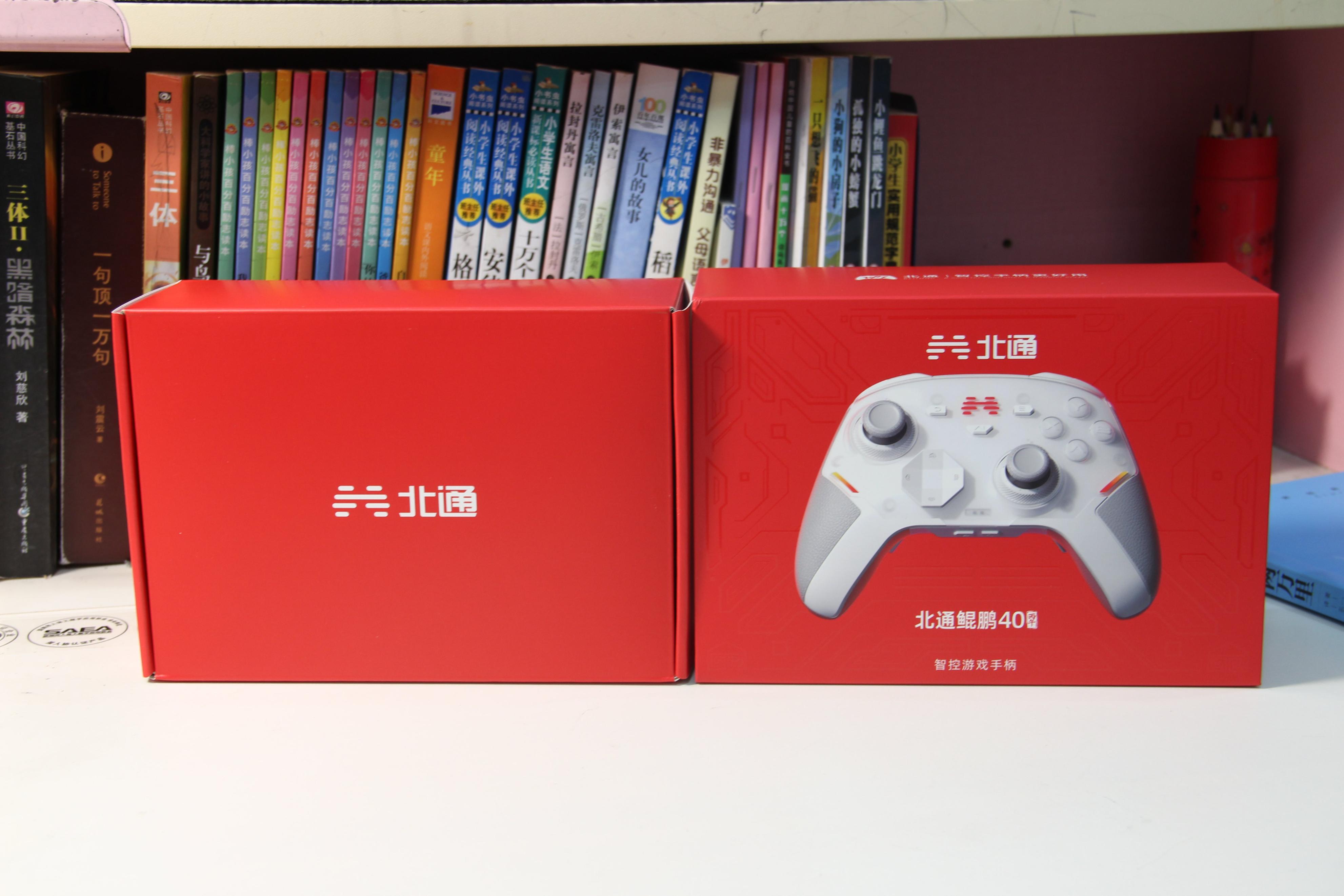 拿到手第一感觉:包装质感真不错!不是那种廉价纸盒,抽屉式礼盒设计,纯红底色加简约白色字体,透着一股喜庆氛围,正面印着手柄轮廓和“北通新鲲鹏40”字样,还有个小“智控游戏手柄”标识,送人居家都合适,高级感拉满。
