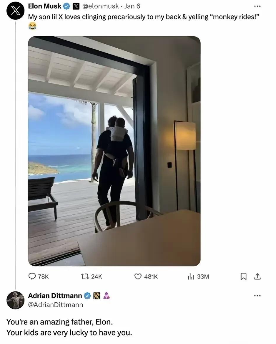 马斯克笑呵呵地接受了这Adrian的马屁精内容! 结果不多久,有人就公开说:哎、其实这个拍马屁的Adrian就是马斯克的小号嘛!因为马斯克曾经用这个小号还搞了直播的呢!被人记下来啦,这一下子就把马斯克弄得有点尴尬啦!马斯克只能不尴不尬的 “呵呵”笑两声!他的笑声难以掩饰 他的对孩子的宠爱以及幸福时光!