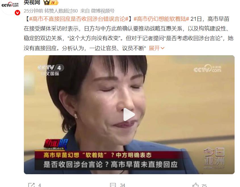 高市早苗在11月21日接受日本电视台采访时,仍坚持原有涉台错误论调,未回应中方要求其道歉的诉求。高市早苗的“软着陆”幻想纯属痴人说梦。
