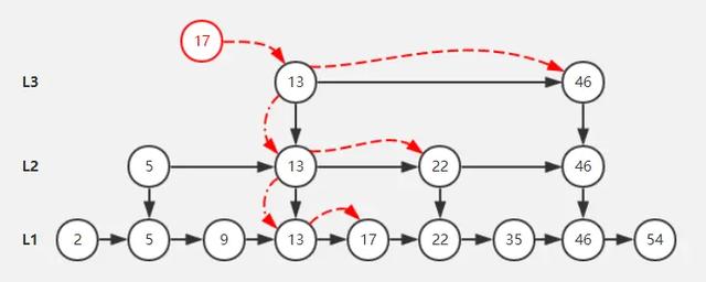 上面是查找元素,如果是添加元素,是通过抛硬币的方式来决定该元素会出现到多少层,也就是说它会有 1/2的概率出现第二层、1/4 的概率出现在第三层......