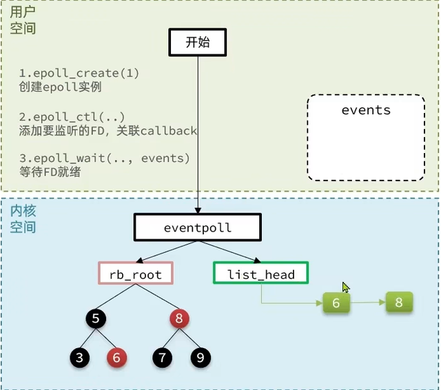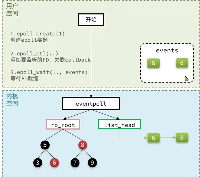 调用epoll_create创建一个eventpoll结构体调用epoll_ctl向eventpoll中注册一个监听连接的serverSocket,并关联上处理accept事件的函数调用epoll_wait阻塞等待fd事件(等待客户端连接)用户程序被唤醒,事件到来(现在只有连接事件)。根据生成的客户端的FD,调用epoll_ctl注册一个监听,并且关联上处理read事件的函数和处理write事件的函数。继续调用epoll_wait阻塞等待fd事件(等待客户端连接或客户端命令执行请求)用户程序被唤醒,事件到来(连接事件或者命令执行请求),假设是客户端执行请求事件,根据客户端的fd对应的read事件直接调用绑定的回调函数来处理,将结果再写回到fd缓存中。继续调用epoll_wait等待accept,read,write事件。epoll优点