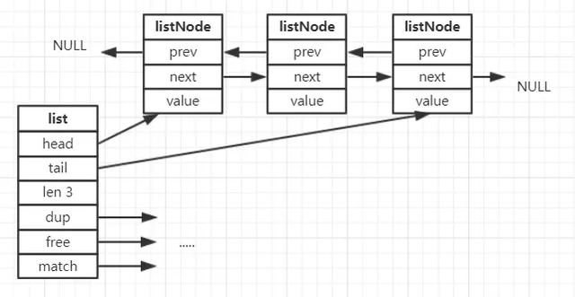 链表节点和链表的定义typedef struct listNode { // 前置节点 struct listNode *prev; // 后置节点 struct listNode *next; // 节点值 void *value;} listNode;typedef struct list { // 链表头节点 listNode *head; // 链表尾节点 listNode *tail; // 节点值复制函数 void *(*dup)(void *ptr); // 节点值释放函数 void (*free)(void *ptr); // 节点值对比函数 int (*match)(void *ptr, void *key); // 链表所包含的节点数量 unsigned long len;} list;每个节点listNode可以通过prev和next指针分布指向前一个节点和后一个节点组成双端链表,同时每个链表还会有一个list结构为链表提供表头指针head、表尾指针tail、以及链表长度计数器len,还有三个用于实现多态链表的类型特定函数