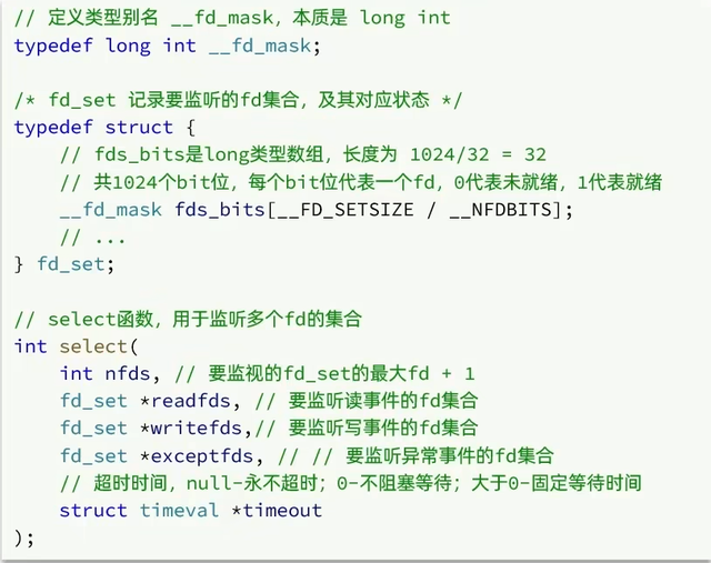 用户空间创建fd_set,把需要监听的位置置1,比如 1,2,5用户空间拷贝fd_set(注册的事件集合)到内核空间内核遍历所有fd文件,并将当前进程挂到每个fd的等待队列中,当某个fd文件设备收到消息后,会唤醒设备等待队列上睡眠的进程,那么当前进程就会被唤醒内核如果遍历完所有的fd没有I/O事件,则当前进程进入睡眠,当有某个fd文件有I/O事件或当前进程睡眠超时后,当前进程重新唤醒再次遍历所有fd文件内核有事件产生,会把fd_set中有事件的位置保留为1,没有事件的位置擦除为0.内核拷贝fd_set给用户空间用户空间线程被唤醒,遍历fd_set为1的位置,确认是哪些fd有就绪事件,然后开始处理用户空间处理完事件,再一次将要监听的fd_set设置为1,重复之前的监听动作根据上面可以很清楚的看出整个执行流程在用户空间和内核空间的切换。