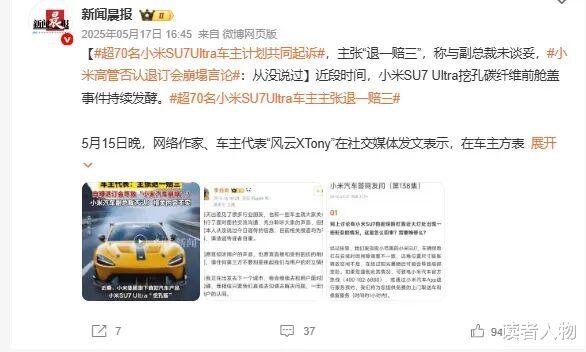 销量崩盘的背后,是口碑的翻车。2025年5月,超过70名SU7 Ultra车主发起集体维权,控诉车辆实际配置与宣传严重不符——宣传中的“碳纤维前舱盖”没有风道,续航里程缩水明显,高阶辅助驾驶功能频繁出现延迟、误判,涉嫌虚假宣传,车主们集体要求“退一赔三”。