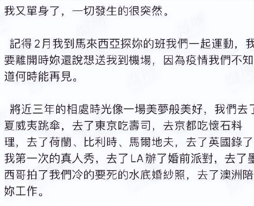 离婚之后他还专门发了一篇帖子,感慨了这段3年的感情。