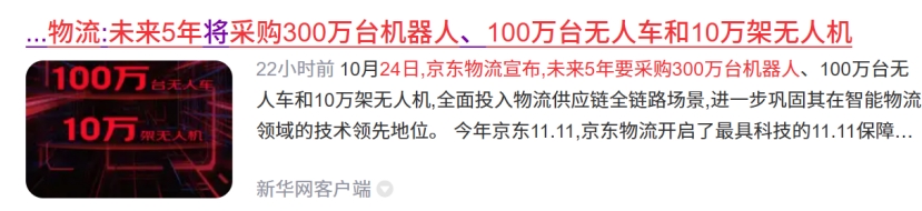 10月24日,京东物流宣布,未来5年要采购300万台机器人、100万台无人车和10万架无人机,全面投入物流供应链全链路场景,进一步巩固其在智能物流领域的技术领先地位。
