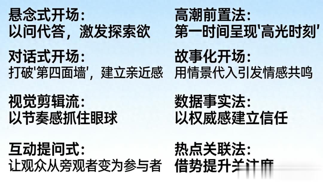 在信息爆炸的短视频时代,用户指尖滑动的速度往往不超过3秒。一个平淡的开场,足以让你的精心制作淹没在内容的海洋中。相反,一个精彩的开场,却能像磁石般牢牢锁住观众的目光,为后续的内容传播奠定基础。如何才能在这关键的几秒钟内抓住人心?以下八种经过验证的开场策略,将帮助你有效提升视频的留存率与互动度。
