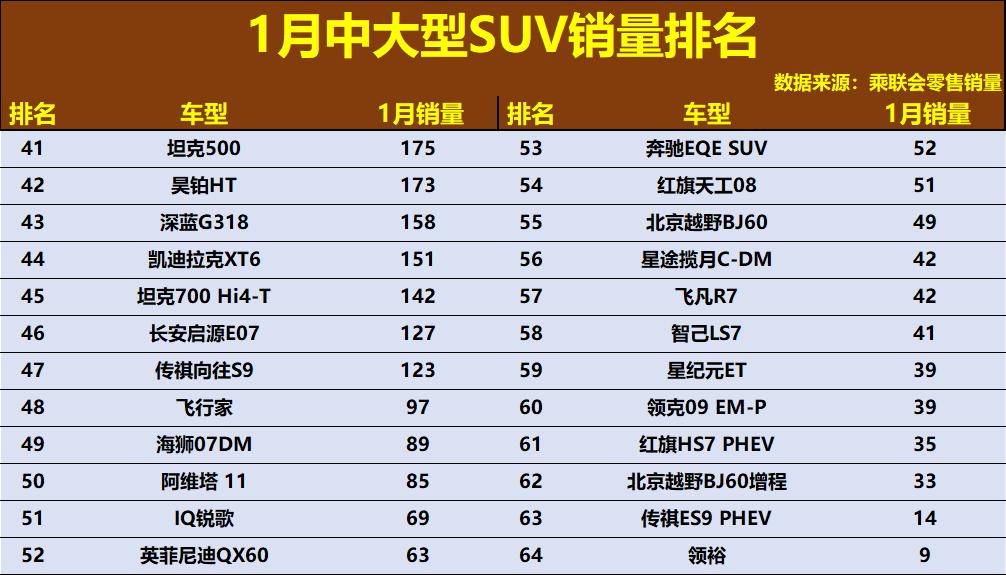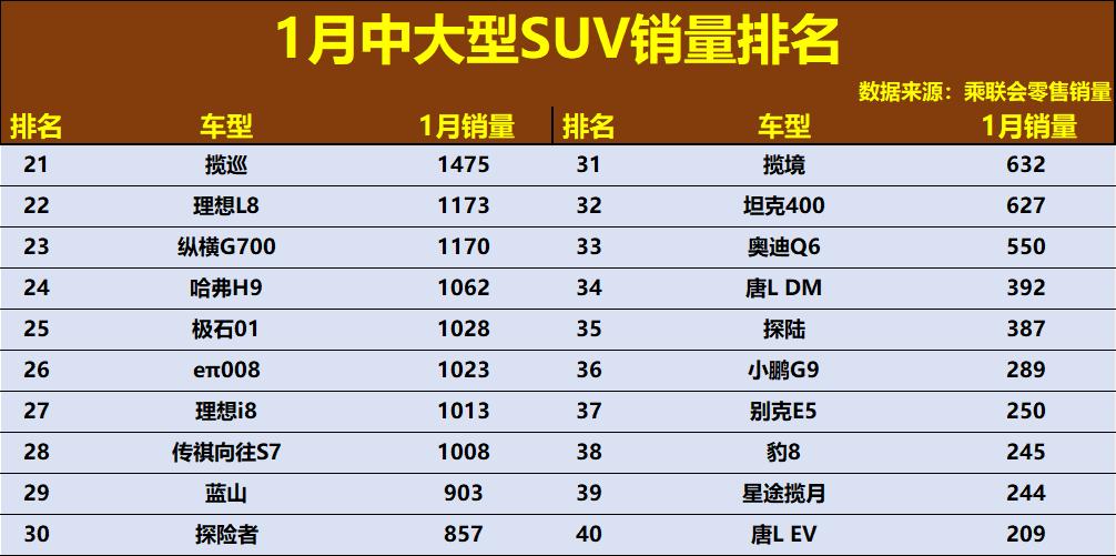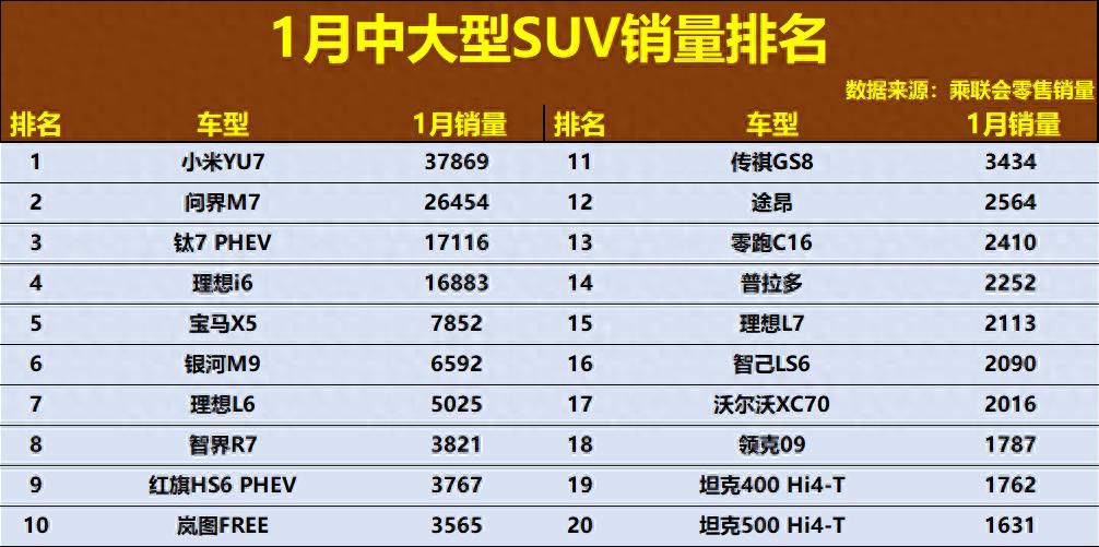 1月中大型SUV销量榜单正式出炉,最直观的感受是市场格局已经彻底改写,新势力实现了霸榜。小米YU7以37869辆拿下榜首,问界M7紧随其后卖出26454辆,两款车加起来超过6.4万台。钛7 PHEV和理想i6双双突破1.6万辆,宝马X5卖了7852辆排第五,是前十名里唯一的传统豪华品牌。从整体看,中大型SUV这个曾经由合资和进口车主导的细分市场,如今已经成为国产新能源的主场。月销过万的车型有5款,全部来自新势力或国产新能源品牌,传统车企只能在一千到五千档苦苦支撑。大混战!1月中大型SUV销量解析:新能源霸榜,理想i6第4,途昂12!