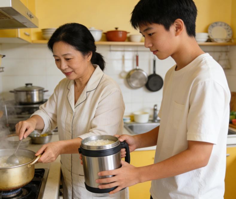 罗子航每天带着这个沉甸甸的保温桶上学,中午休息时,他不再去校门口闻那些诱人的烧烤味,而是坐在座位上,一口接一口地喝着那些白得发亮的肉糜粥。