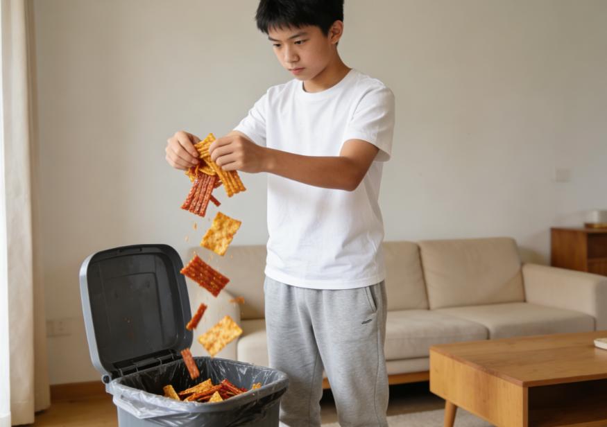回到家后,罗子航像是变了一个人。他亲手把书包隔层里藏着的半包辣条、两袋油炸干煸豆角全扔进了垃圾桶,连看都没敢多看一眼。