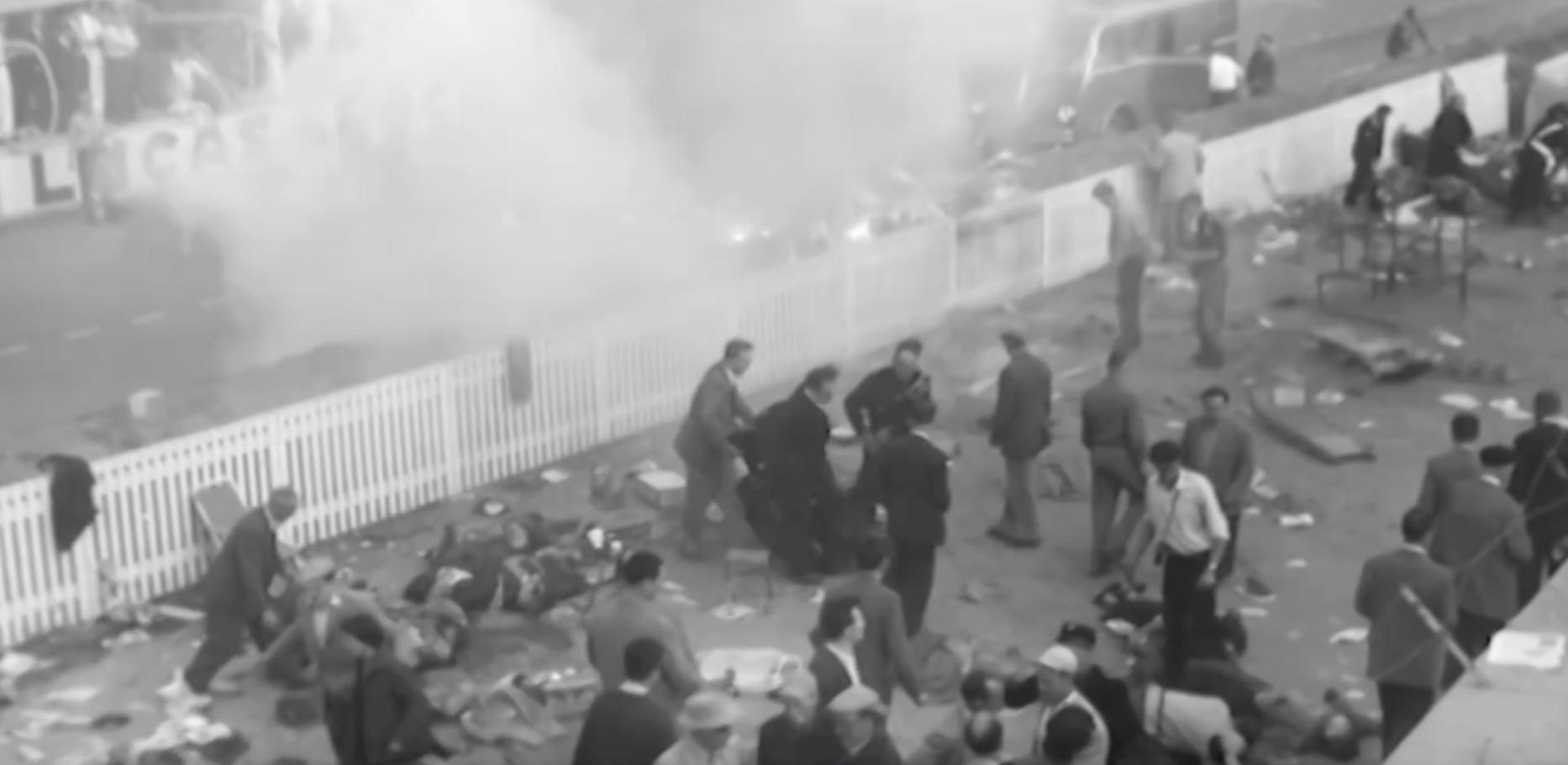 但这个奔驰车手就没那么幸运了。奥斯汀就像一个斜坡将奔驰抛向了观众席。在飞跃了几十米后,奔驰先是砸在了观众席上。在这一瞬间,发动机、底盘、车架、机箱盖纷纷解体。在惯性的作用下,这些碎片又向前飞了几十米。而这些碎片犹如一个个致命的飞刀,所到之处,一片狼藉、非死即伤。