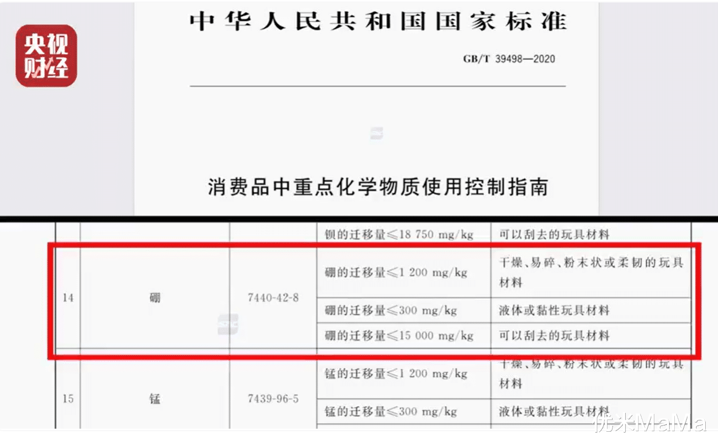 央视记者送检了3款软泥玩具,最高的一款玩具硼迁移量达2527mg/kg,是国家标准(≤300mg/kg)的8倍;
