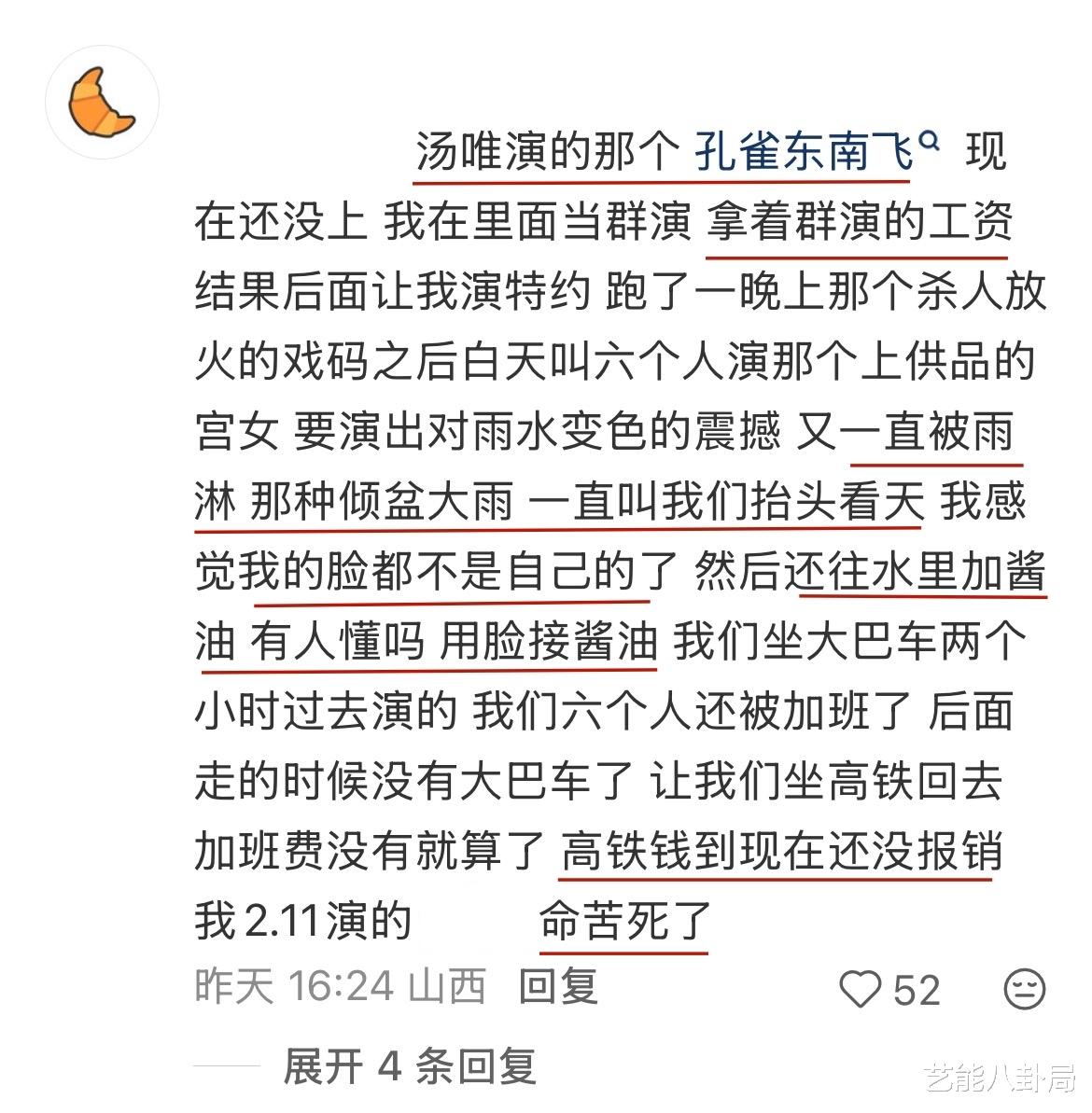 拍摄结束后,剧组不仅不发加班费,连回程高铁的发票都不给报销,她回想起来满是委屈,“命苦死了!”
