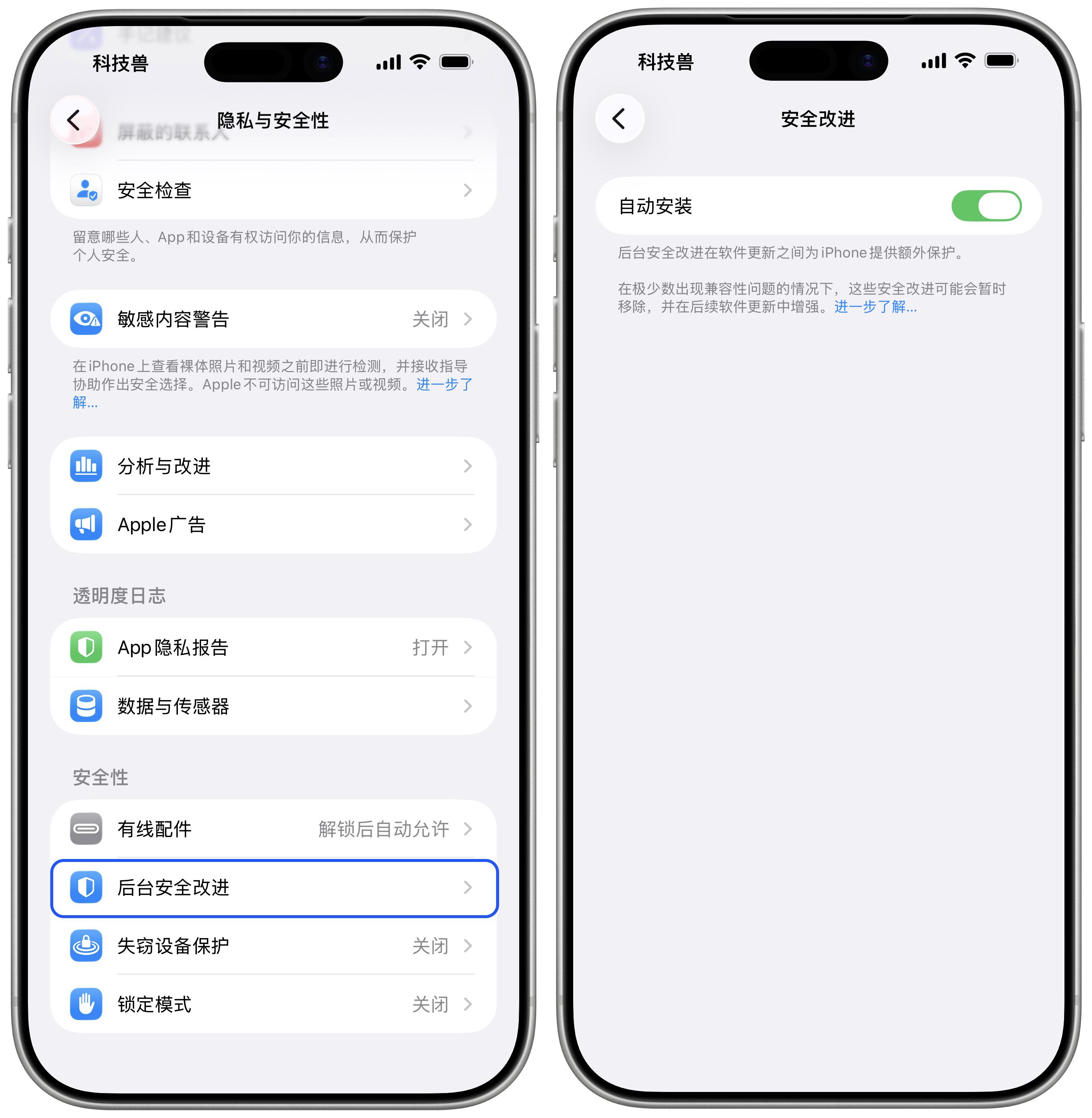 隐私与安全性:新增后台安全改进功能在隐私与安全性设置中,Beta 2 版本新增了后台安全改进功能。该功能应该是指 iPhone 在不更新系统版本的情况下,自动安装安全补丁。