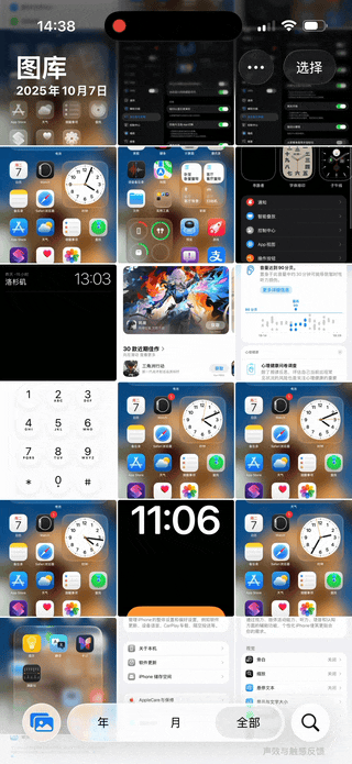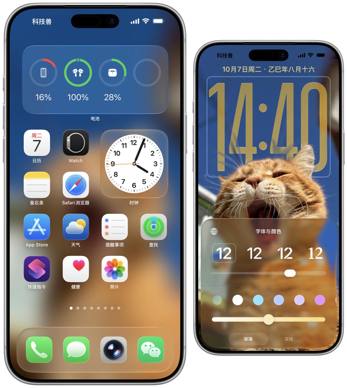 包括主屏幕 Dock 栏的液态玻璃样式,也比此前的版本更通透一些。锁屏界面自定义时间字体与颜色的菜单终于获得液态玻璃样式。