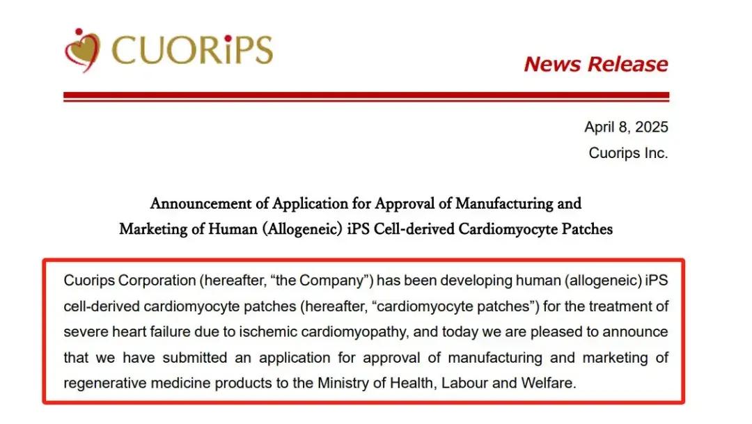 2025年4月8日,Cuorips公司宣布,研发团队研发出一种利用诱导多能干细胞(iPS)来源的心肌细胞贴片,该产品用于治疗心力衰竭。