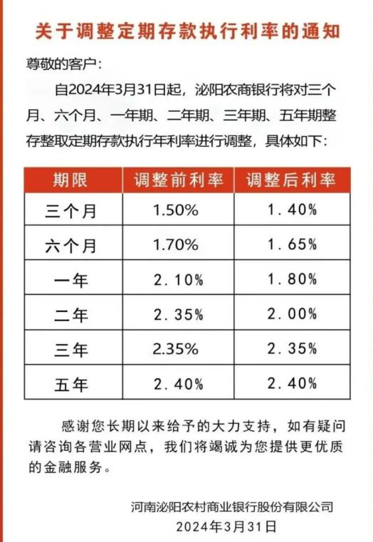 多家银行“降息”。来自河南、陕西、山西、云南等地的中小银行密集发布公告,宣布下调定期存款执行利率。据不完全统计,存款利率下调幅度从5个基点至45个基点不等。 据上海证券报,市场人士认为,大中小型银行通常采取“梯次”调降存款利率,此次多地的区域银行下调存款利率,仍属于去年第三轮商业银行存款利率调降的延续。而在银行存贷利差空间进一步压缩的压力下,上半年全国性银行可能开启新一轮存款“降息潮”。