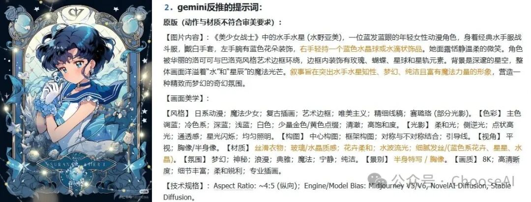 检查gemini反推的提示词时,我们的注意力可以重点放在人物形象描绘、动作描述和装饰元素上。检查豆包和chatgpt反推的提示词时,就还需要关注画面美学。