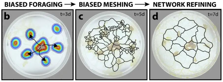 论文中,他和其他作者先是从营养吸引的智能体群体中生成一个站点响应网格,然后独立地计算出一个灵活的、邻近定义的最短路径,进而生成最终网络。据了解,黏菌能够通过 1 毫米/小时至 1 厘米/小时的生长速度形成原生质的管状网络。当黏菌在前进道路上遇到离散的食物源的时候,它会从最初的网状结构发展成精细的网络。尽管许多生物体通过神经回路来处理、学习和适应信息,但是黏菌却依赖于分散的、呈现出流体形式的自适应物理计算法则。