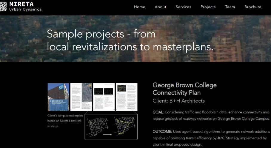 目前,该公司已经在官网展示了几个客户案例。在名为“乔治布朗学院连通计划”的客户案例里,Mireta 基于交通数据和洪泛区数据,减少了乔治布朗学院的校园拥堵,使用基于代理的算法生成网络,将传输效率提升了40%。
