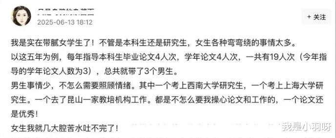 李教授统计发现,其指导的19名学生中16名为女生,而情绪化导致的沟通成本占据了他70%的精力。